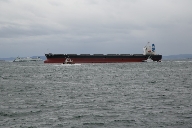 This was a cold, windy day which made being outside somewhat uncomfortable. But, adverse weather notwithstanding, it was cool to watch the team undock and redock a ship. The whole process took less than 30 minutes for both ships once the process got started. These ships are large and the loading process takes many days. When a new ship arrives at the terminal, it is greeted by a string of grain trains bringing cargo to load. It looks to me like it takes 5-7 train loads to fill a ship.