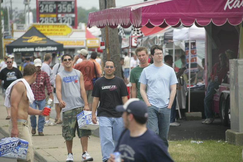The area around the track was a zoo. There were tons of people and tons of vendors. And plenty of beer. Note these two fellows above carrying beer. They are smiling because they are checking out the truck.