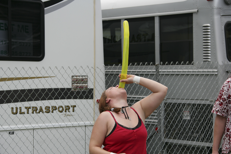 The area around the track was like a carnival, complete with folks doing stunts. Here, this lady is swallowing a balloon to the hoots of the male onlookers.