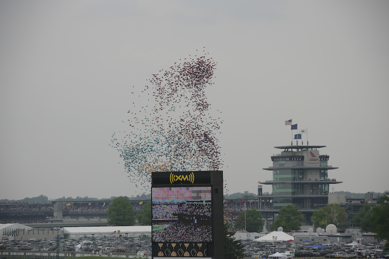 The start of the race is accompanied by the release of several thousand balloons. I am not sure where they end up, but hopefully not in the flight path of the airliners inbound to Indy airport.