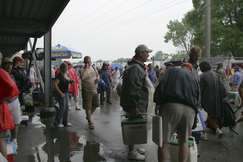Ugh, another crash. Again, without injury. Later, after about 100 laps, the rain started in earnest. The race was stopped due to the deluge and about 1/2 of the crowd left. We did too.