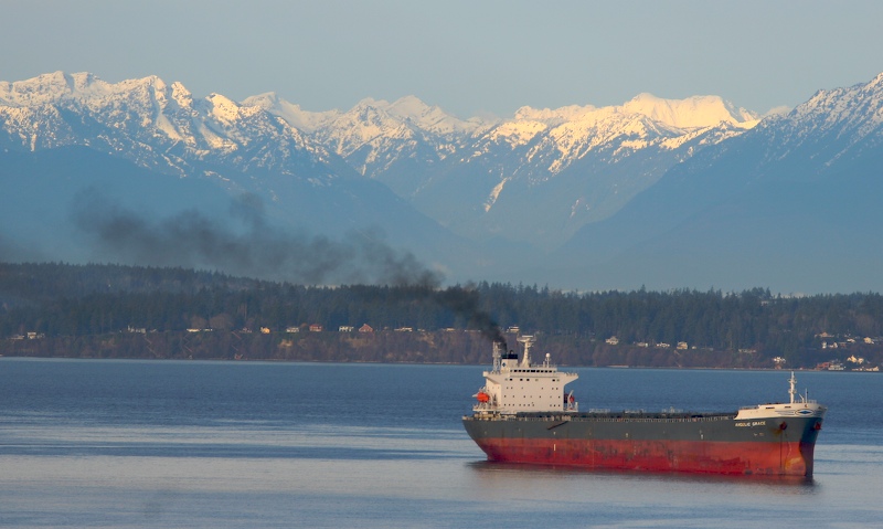 Early morning found the "Angelic Grace" anchored in Elliot Bay awaiting a load of grain. The Olympic mountains are in the background as is Bainbridge Island.