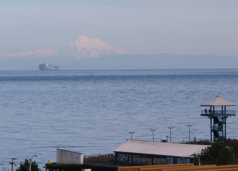 All roads lead to Port Angeles. We drove up the hill to an outlook point and were able to see this cargo ship heading into port with Mt. Baker in the far distance obscured by marine haze. We later climbed the observation tower in the lower right of the photo.