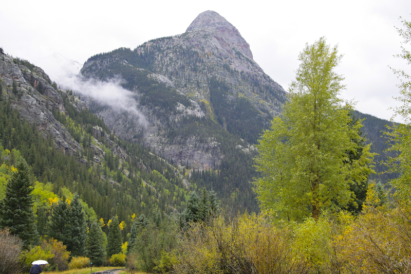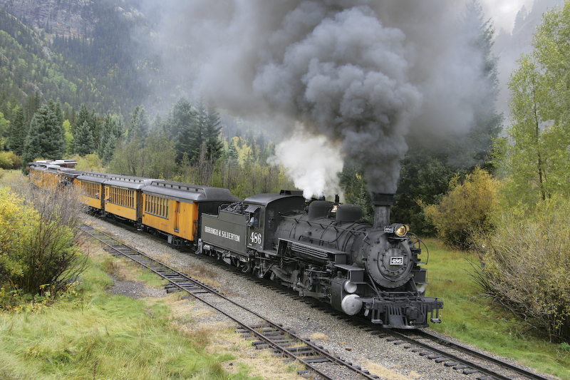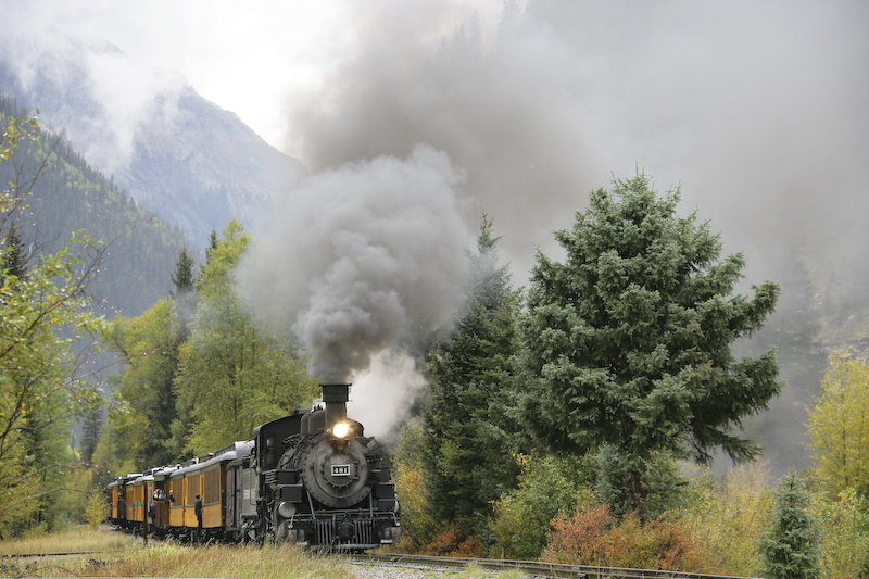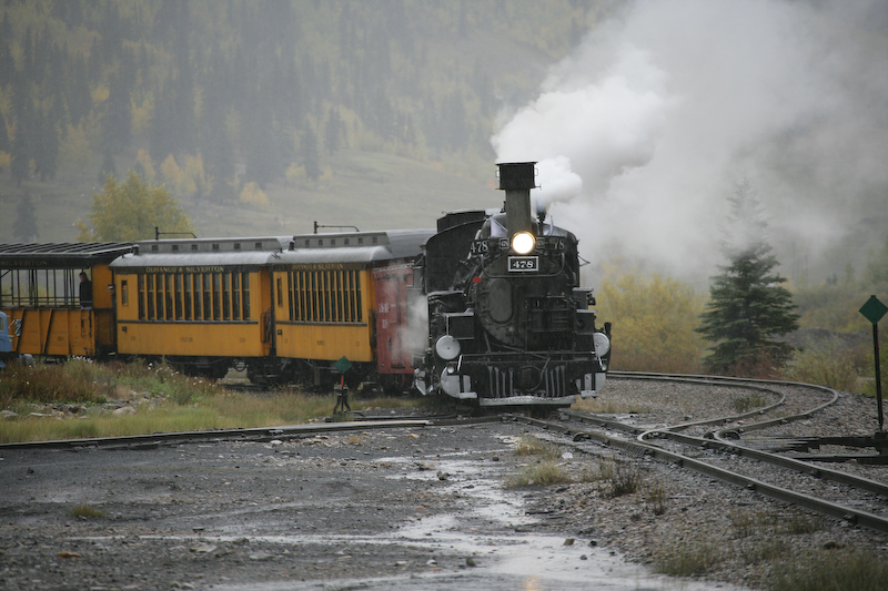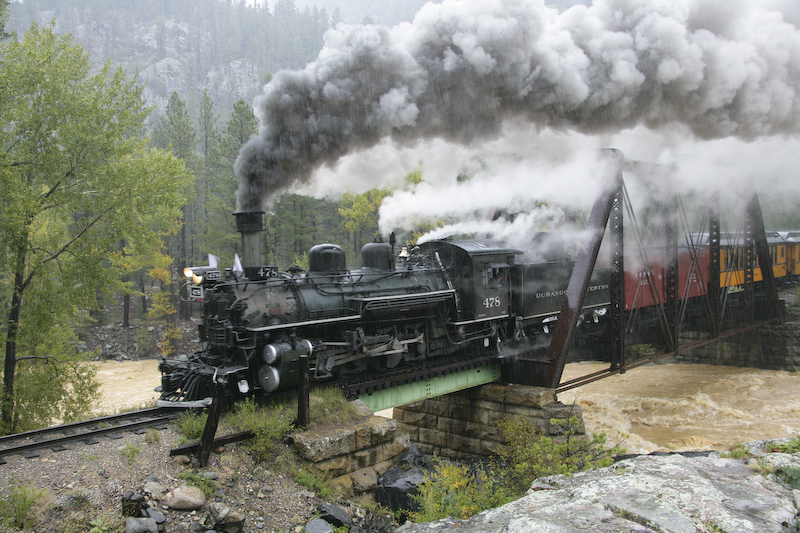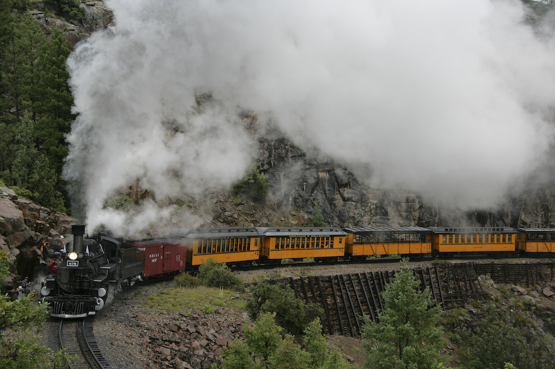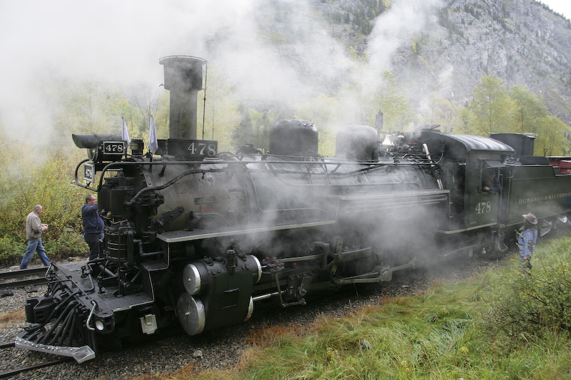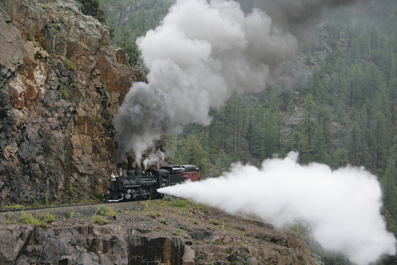 We had planned our trip to travel on the Durango and Silverton Narrow Gauge Railroad for many months. The train travels in the Animas River canyon which is both steep and narrow. The DSNGRR runs old narrow gauge steam locomotives that were part of the Denver & Rio Grande line. Most of the locos have been in continuous service since their construction in 1923. We signed up for the photographer's special trip that allowed the passengers to get off the train and have the train do a "run by" thus allowing photos. Since this was a special trip, we only traveled down hill from Silverton and therefore had to take a bus from Durango to Silverton at 0700. Sadly, it was raining heavily nearly the entire trip resulting in flat lighting and totally soaked clothes. I am happy to report that my Canon 1DsM2 camera is claimed to be "weatherproof" and I concur with that claim. It rained heavily and all the equipment was wet in addition to the passengers. Many of the other photographers reported damaged or failed equipment due to the moisture. I was not one of them.