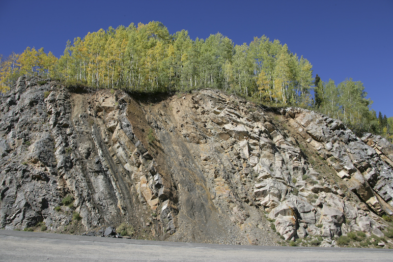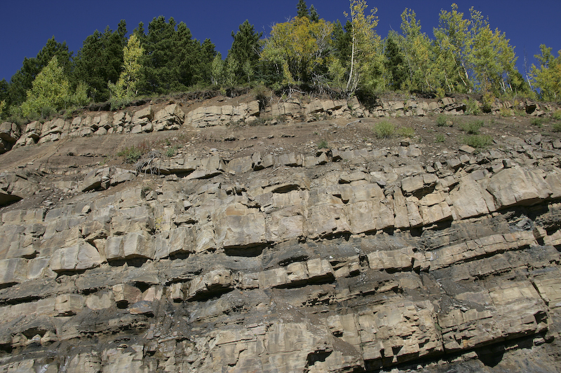 A view of the local road side geology. Note the bedding in the rock.
