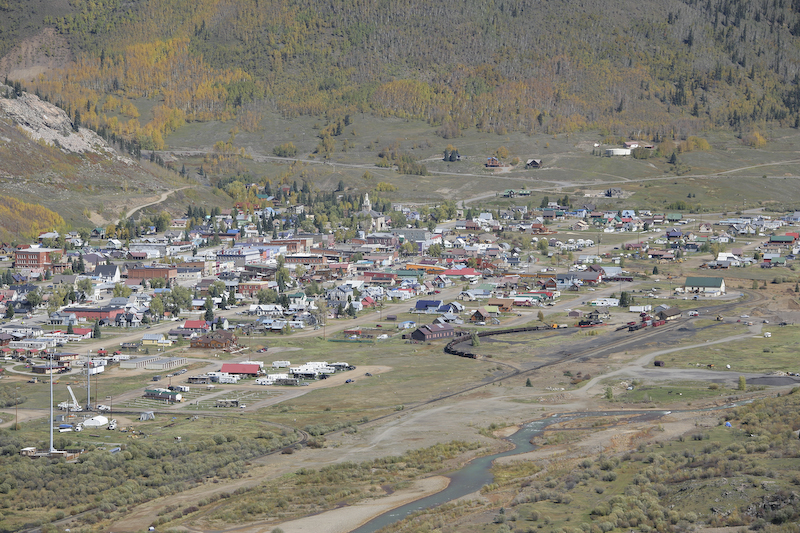Silverton, Colorado as seen from the Molas Pass downgrade. The D&SNGRR tracks and station are visible in the right center of the photo.