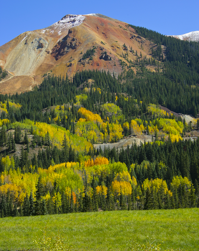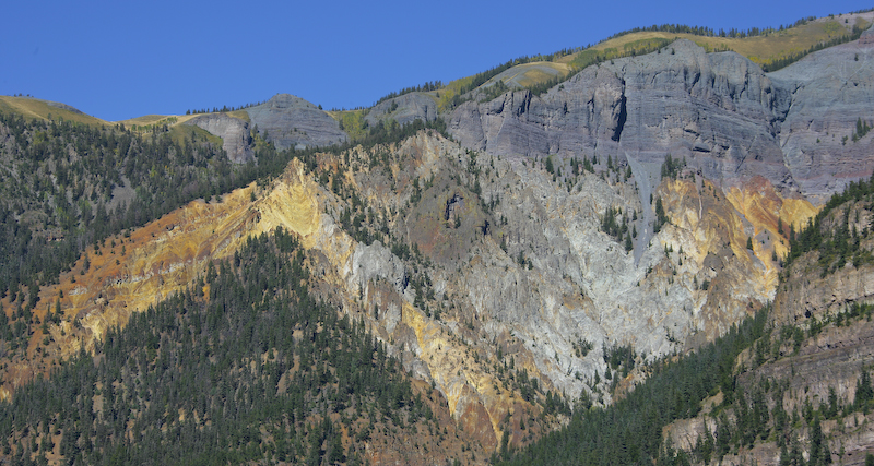 The mountains around Silverton, indeed the entire San Juan range are heavily mineralized due to the volcanic activity and uplift. That mineralization results in the rich colors in the rocks. The mineralization is clearly visible on the flanks of this mountain as seen from the Molas Pass downgrade.