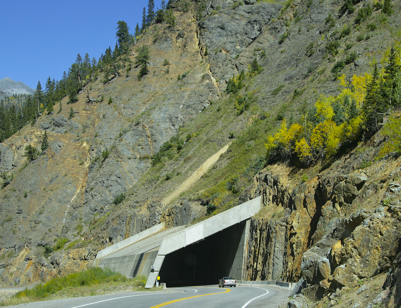 A snow shed protecting the highway from avalanche damage.