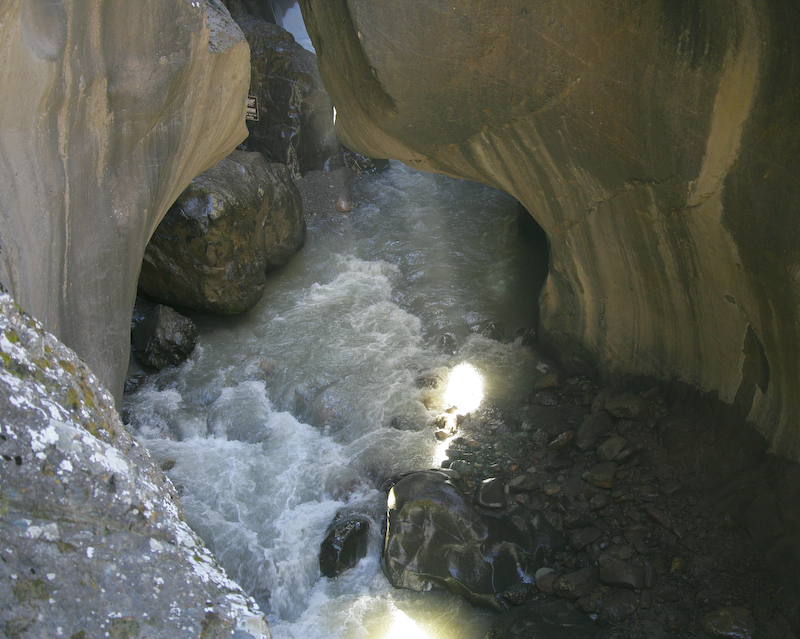 Looking upstream into Box Canyon. Note the vertical beds on the right.