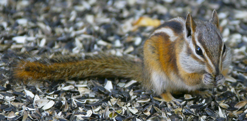 On the exit from the falls, we came upon this small critter. The sign says "Do Not Feed the Chipmunks". Right. Notice the huge bed of sunflower shells.