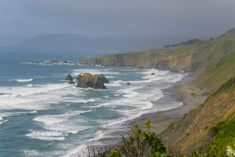 This portion of the coast is not quite as rough as Oregon, but still has the same basic structure with large headlands and sea stacks. There are a large number of small stacks at the foot of this cliff.