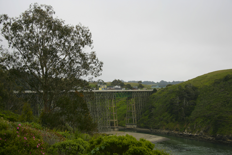 This is the highway 1 bridge that crosses the Albion River. Only the center span is steel, the balance of the structure is wood.