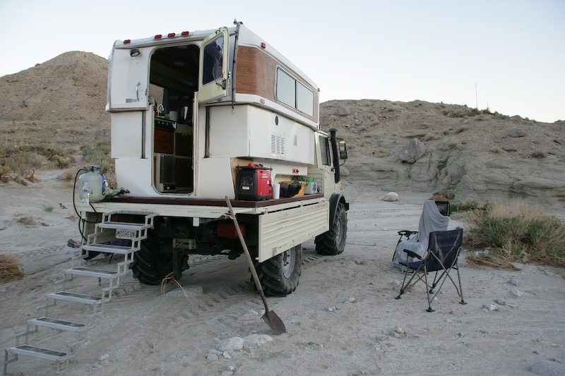 After many weeks of effort, we were finally ready for a field test. We checked the weather and were promised a nice hot day in the desert, so we paced our stuff and left. Our destination was Fish Creek Wash in the Anza-Borrego Desert State Park east of San Diego. The photo above shows the Unimog with camper attached in the "travel configuration" with the top lowered.