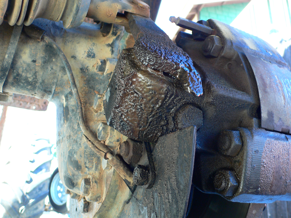 This is what the leak looked like. At first, I thought that my repair job on the rear wheel bearings had failed. But, on closer inspection, the fluid was not gear oil, but rather brake fluid.