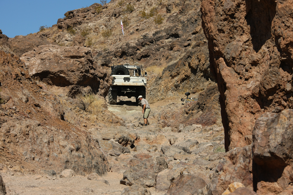 Past the slot canyon, there were many more rugged obstacles. Above, Kai rolls some rocks to make some of the obstacles drivable without damage.