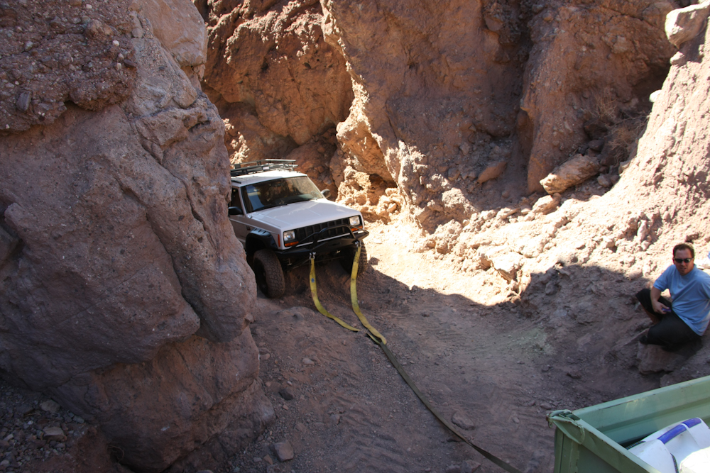Because of the tight quarters, a "short leash" was required. In the end, we used the front winch on Red Bull to act as a tow line. This is not recommended as it will likely damage the gears inside the winch, but one of the front tow points had already been ripped off so we had no choice. When it was all over, the winch still appeared to work. In the photo above, the light spot in the center is not from a flash, but rather from my headlamp -- I failed to bring a flash for the camera. We slowly worked our way through the slot canyon to the dirt bypass below. Two mogs were tied together to provide the tractive force to pull Red Bull up the hill and out of the canyon back to camp. Estimated total time to extract vehicle: about 9 hours.