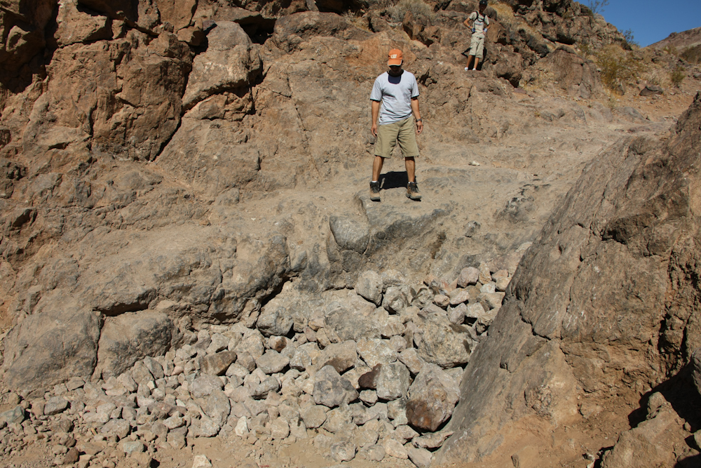 A lot of rocks had been piled at the bottom of the face. When winter rains come, they move these rocks and change the trail, requiring repair actions to make these obstacles passable. Above, you can see the size of the face; even with the boulders, it is still a sizeable obstacle and not all trucks can do it. Note the rubber on the rocks deposited by spinning tires.
