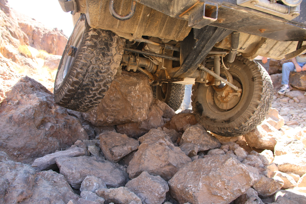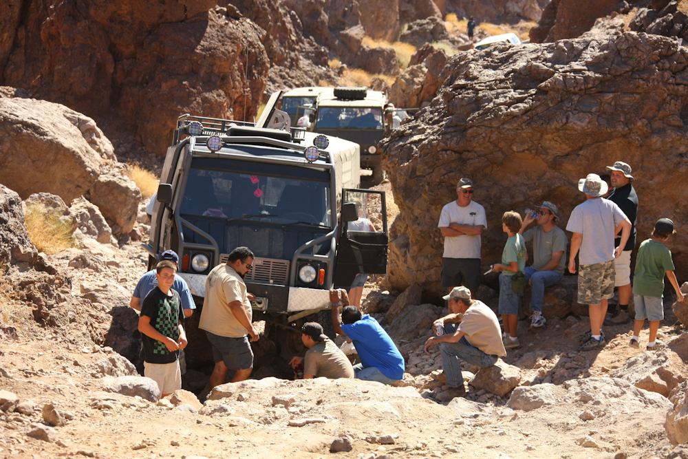 We had to roll a number of large rocks to allow passage of the truck. And, the high-lift jack was required to unload the chassis so the high center condition could be removed.