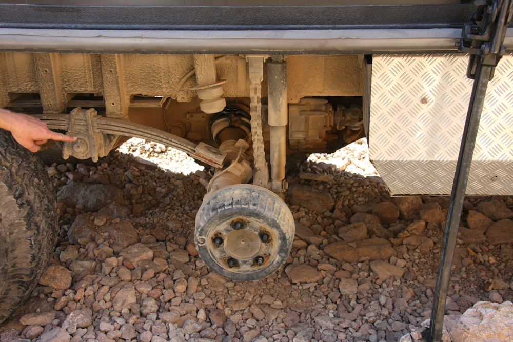 The only solution was to remove that tire to see what was going on. Not good; this axle is broken as well. It has rotated out of position and came off the spring stack.