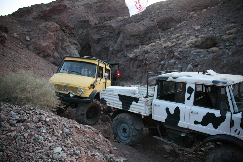 After dinner, at about 1830, we returned to the scene of the crime. The guys had managed to turn the truck around, but had not moved more than perhaps 100 meters. A gas-powered Unimog 404 came to assist in the towing, but did not have sufficient mass and power to handle the big boulders. Above, the group discusses the next step. It should be noted that despite what the photo above might suggest, it was actually quite dark at this point.