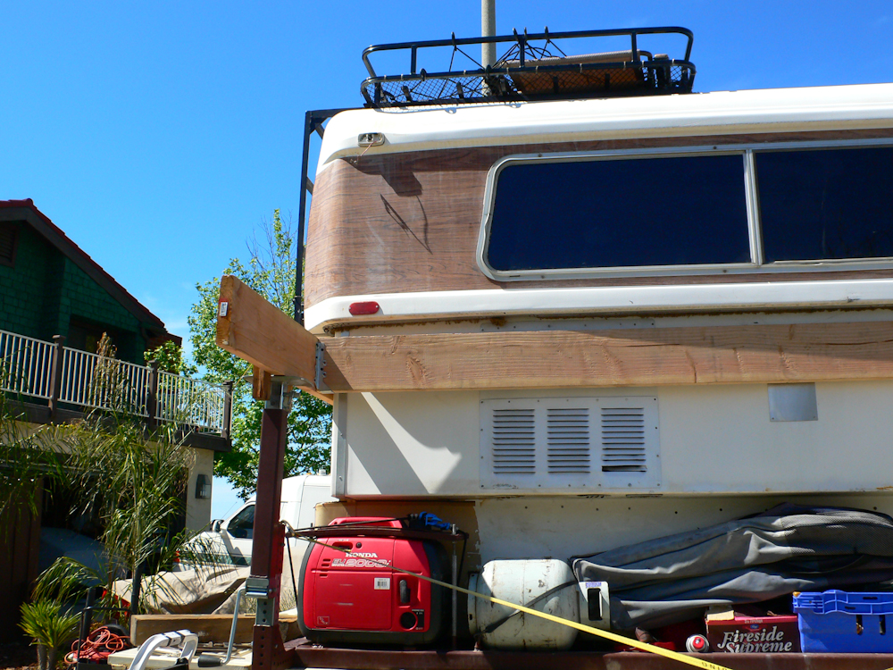 It works: we lowered it, and then raised it again. No leaks visible (yet) so wish us luck. We still have to replace the hinges on the doors and hang them on the camper shell.