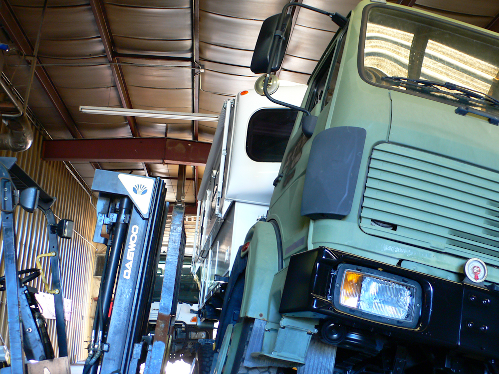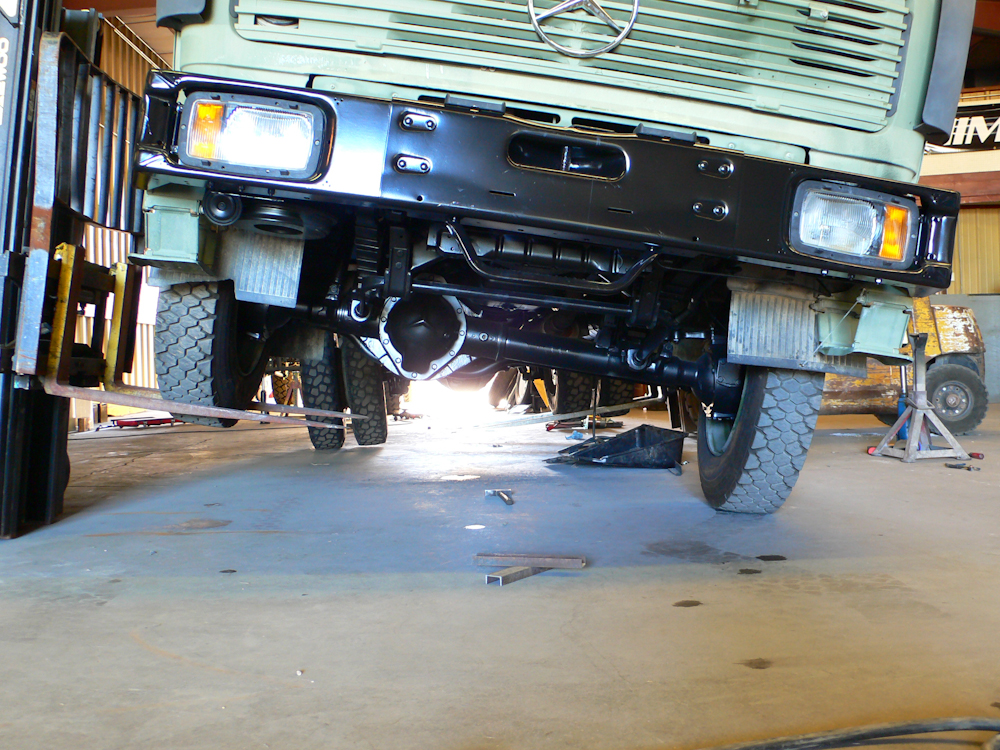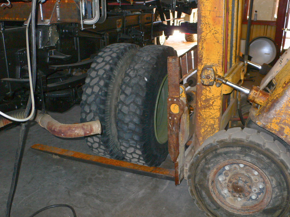 to use the fork lifts to elevate opposite corners of the truck and see