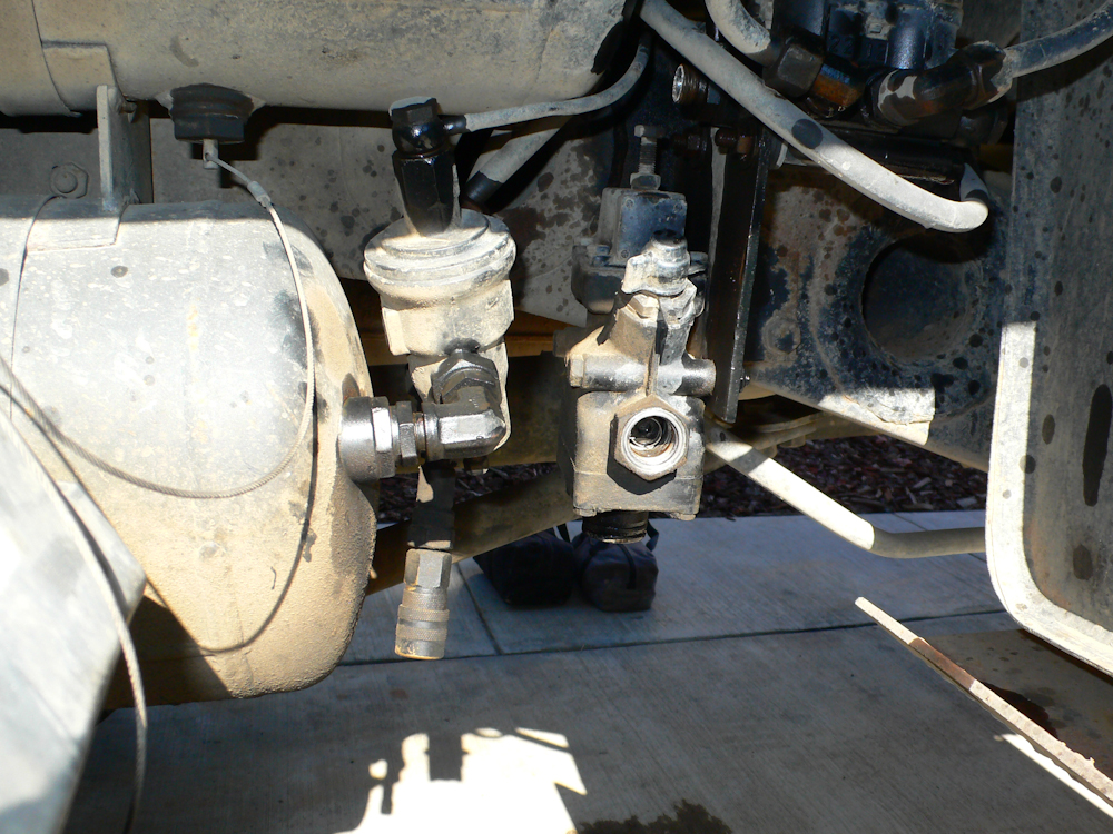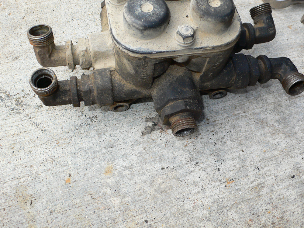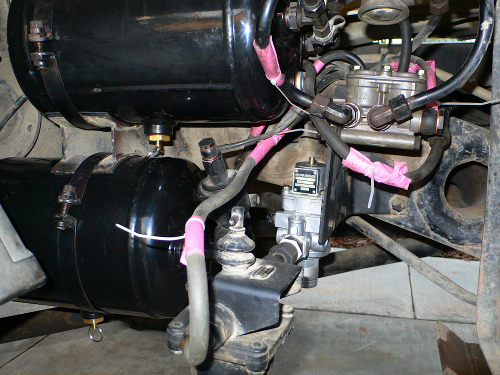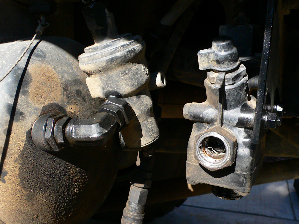 Once we were finished with the radiator, we went on to service the air system. Most of the components in the system are, to the best of my knowledge, original equipment 30 year old parts. I have had recurring issues over the years, usually traced back to rust and contamination in the air system. My conjecture was that the tanks were rusty and most of the other valves and pressure limiters were contaminated with rust and gunk. So, the simplest thing, albeit the most costly and time consuming, was to replace it all. So we did. In the photo above, several lines have been removed showing the exit port for the unloader valve. That guy was totally gunked up.