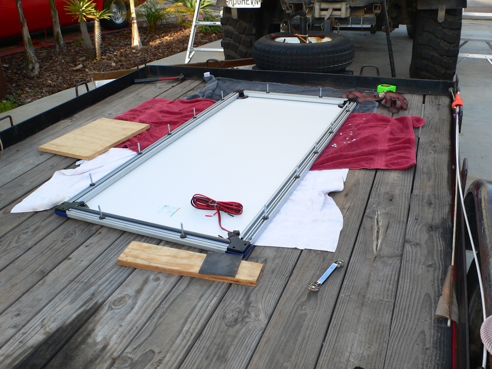When we completed the tires, we decided to add a 130 watt solar panel. We have discovered that the mog, when operated a low RPM, never generated sufficient current to recharge our 200 amp-hour house battery array. We have a small Honda generator, but that is a hassle as well as noisy. Plus, if you are stationary for several days you MUST run the generator or the batteries will die. Following the lead of our friends Steve and Debra, we added a high power panel. This panel is marine-grade and absent some mechanical trauma, it should last for many years.