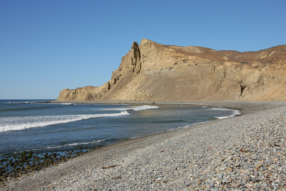 Many of the beaches were made of small, wave action cobbles.  In many places, the cobbles were sufficiently steep that walking down them was difficult.  Walking up is a totally different story as the rounded stones are like ball bearings and slip under your feet.  Later in the day, we went  down one of these cobblestone berms and had difficulty getting back on top.