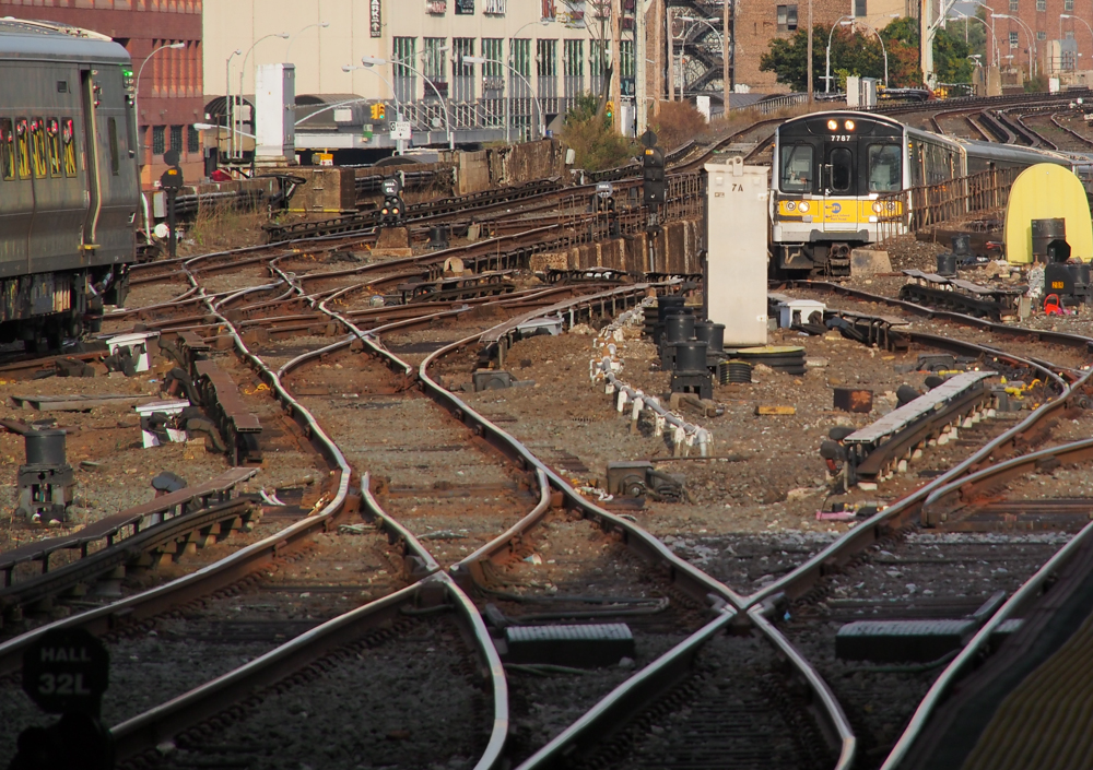 All told, suffering coach seats was not that bad.  But, there was no food sold offered on the plane -- not even peanuts.  The good news was that we brought granola bars and our own water.  The flight actually arrived early and we got from JFK to Jamaica Station with relative ease.  While waiting on the platform for the train we could see the tracks to the east of the station.  Note the waviness of the tracks.