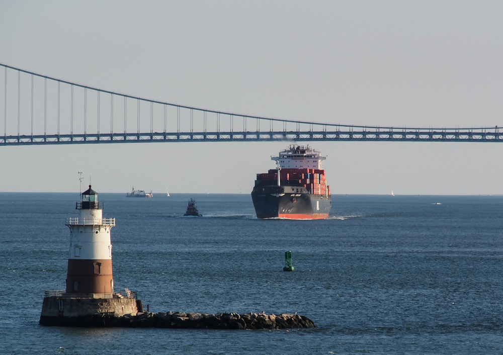idge crosses the lower Hudson River and is one of the busiest waterways in North America.  Above, a tug shadows a large container ship on its way to port, presumably in Bayonne.