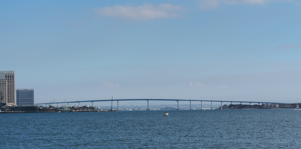 view of the Coronado Bridge that spans San Diego bay and