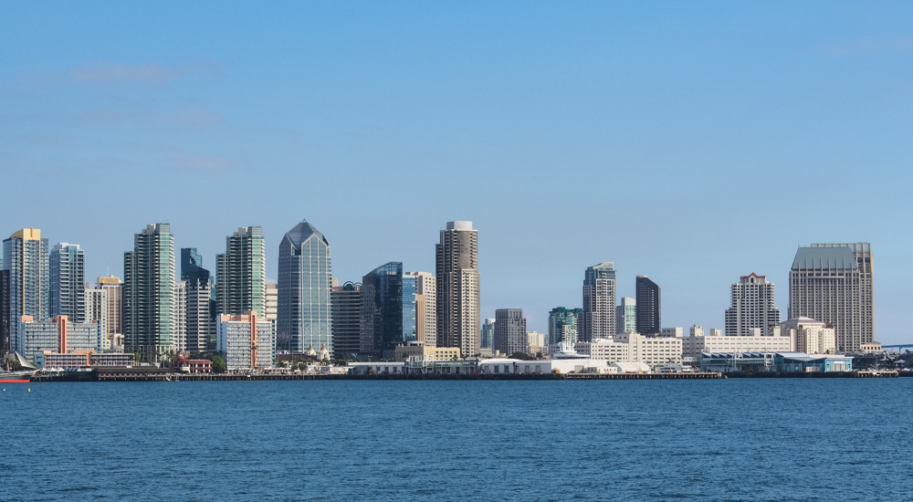 Bay-side view of the San Diego skyline and Coronado Bridge.
