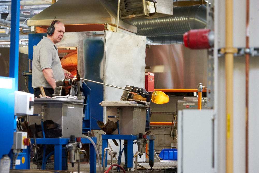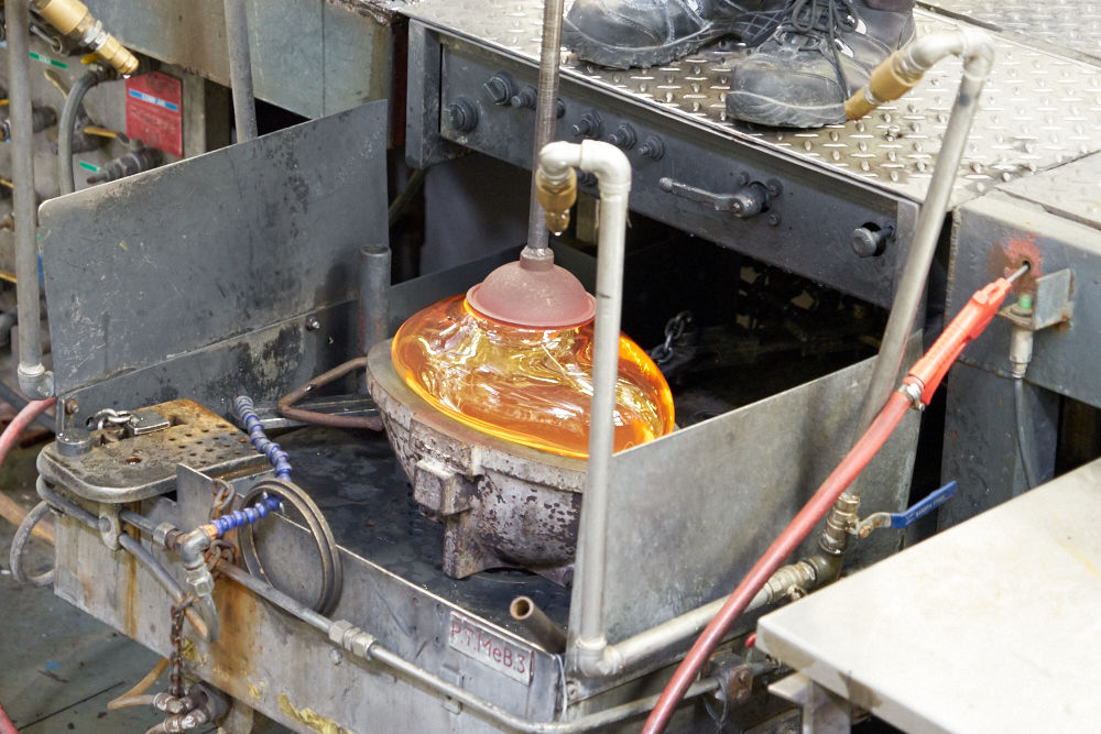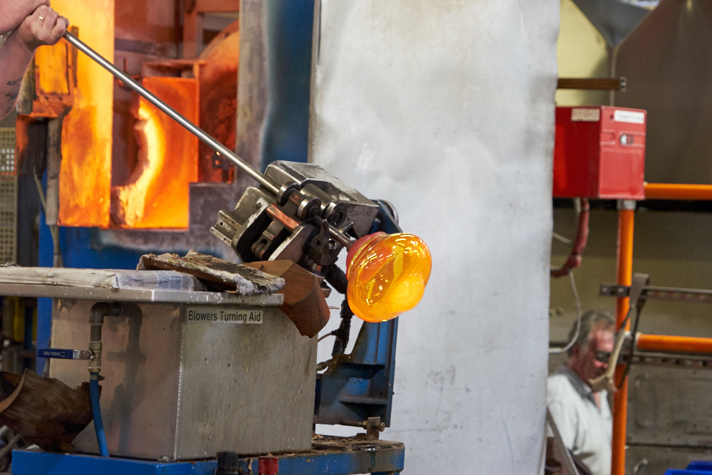 glass is blown while being spun to maintain symmetry.