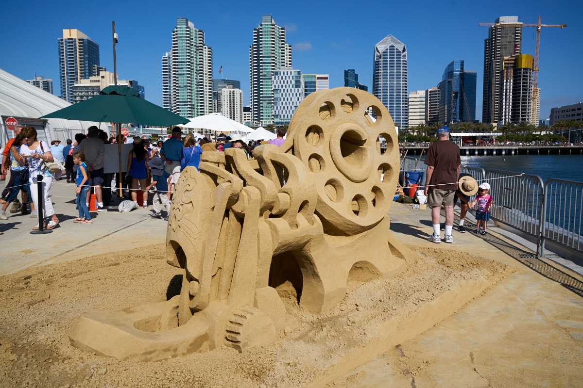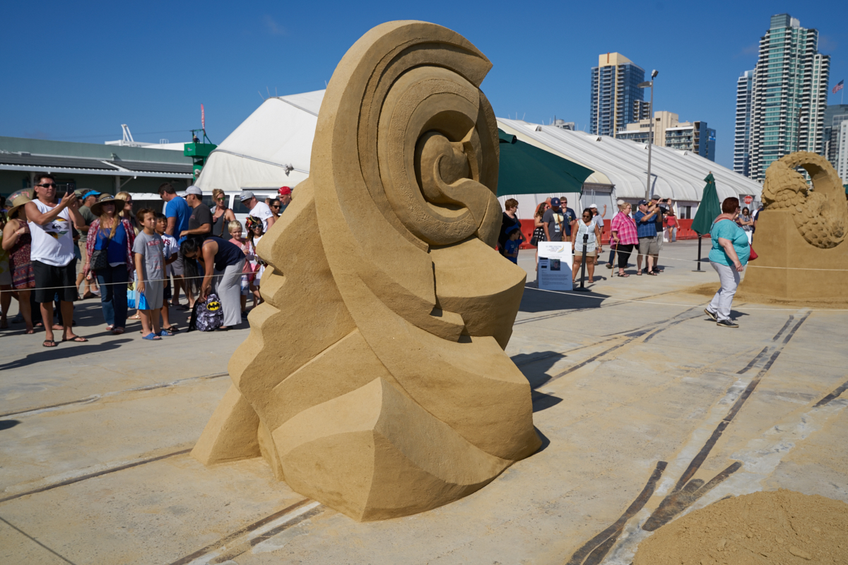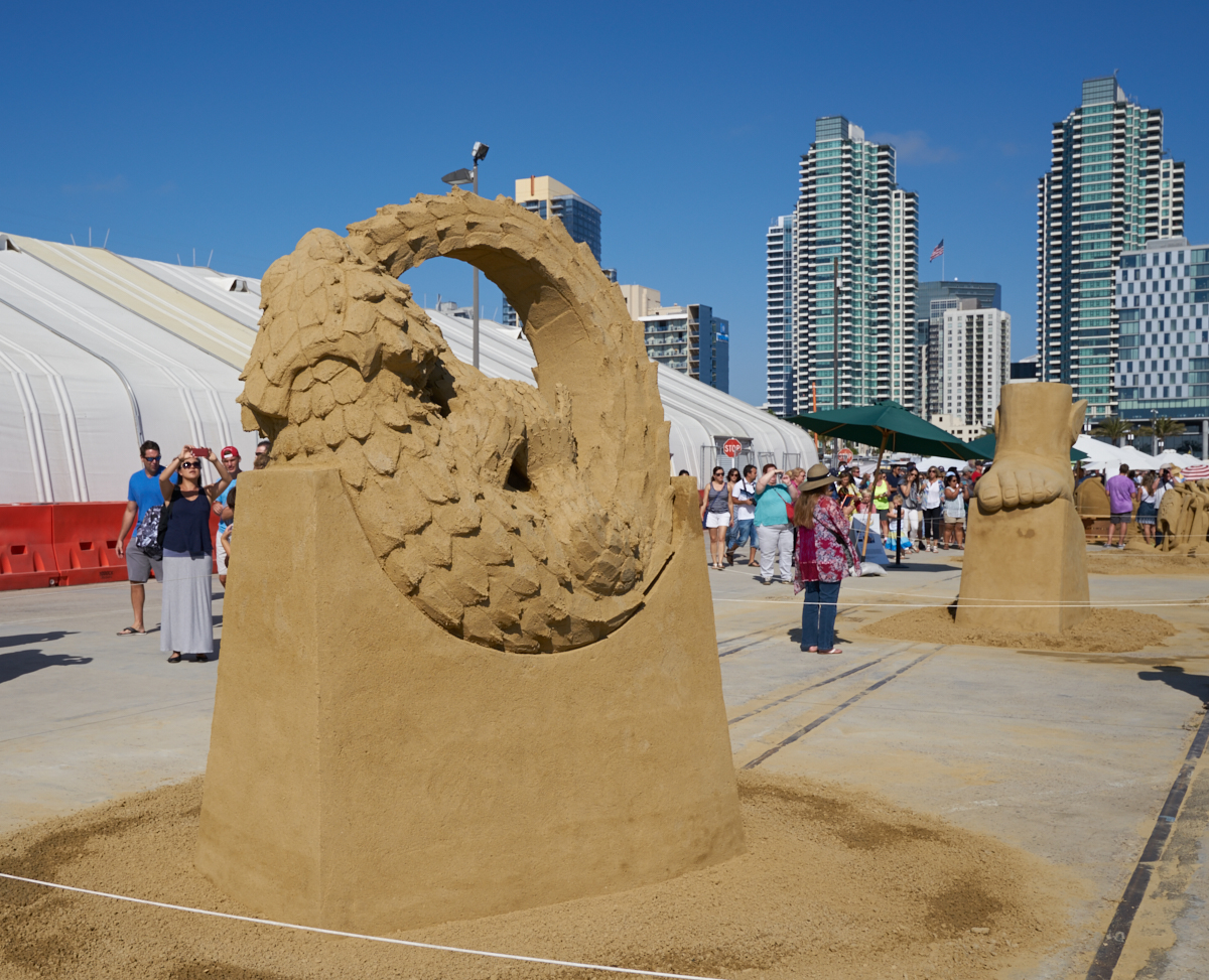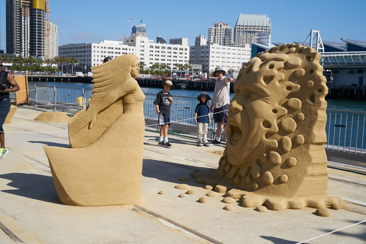 It was a super-nice Santa Ana day with temperatures in the mid-eighties, clear and no wind.  Kathleen had noticed that there was a "sand sculpting" (the current cool name for sand castles) competition at the B Street Pier.  It was Labor Day weekend so we headed downtown to check it out.
