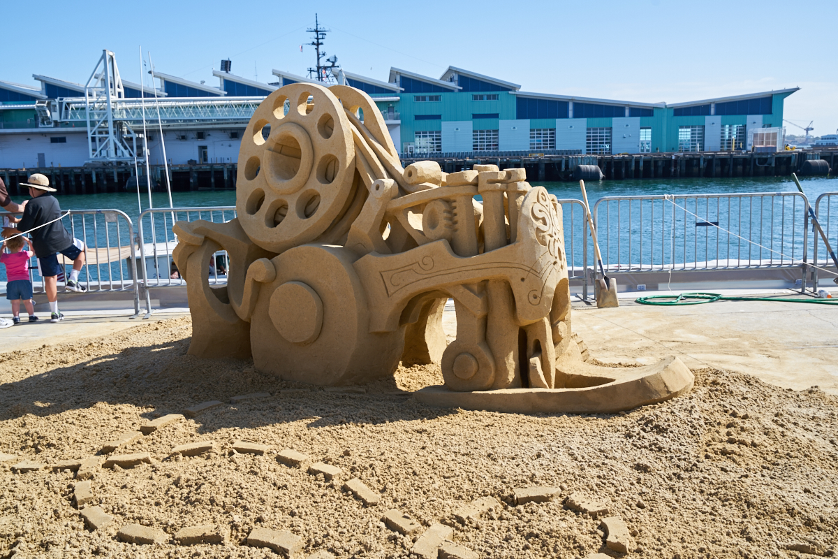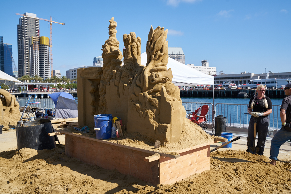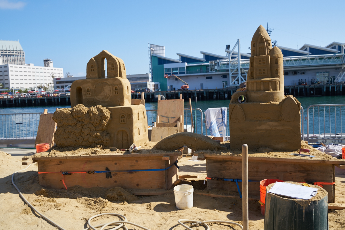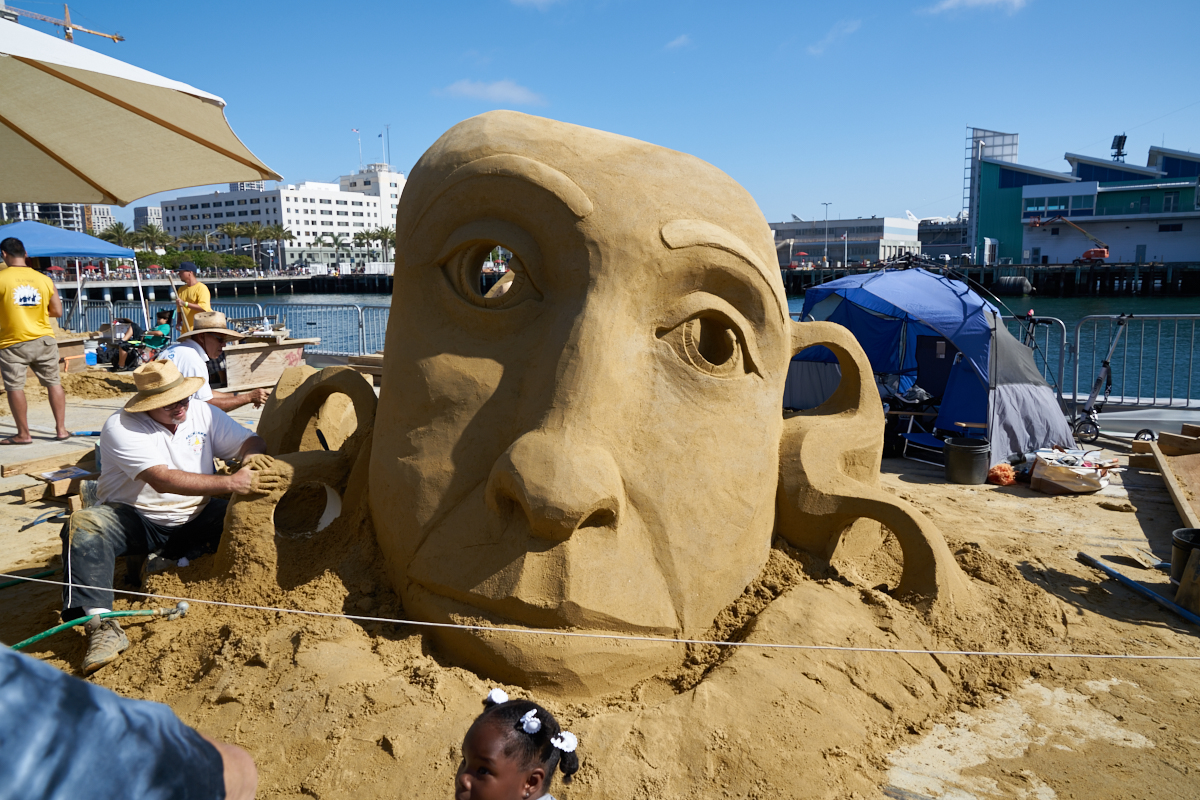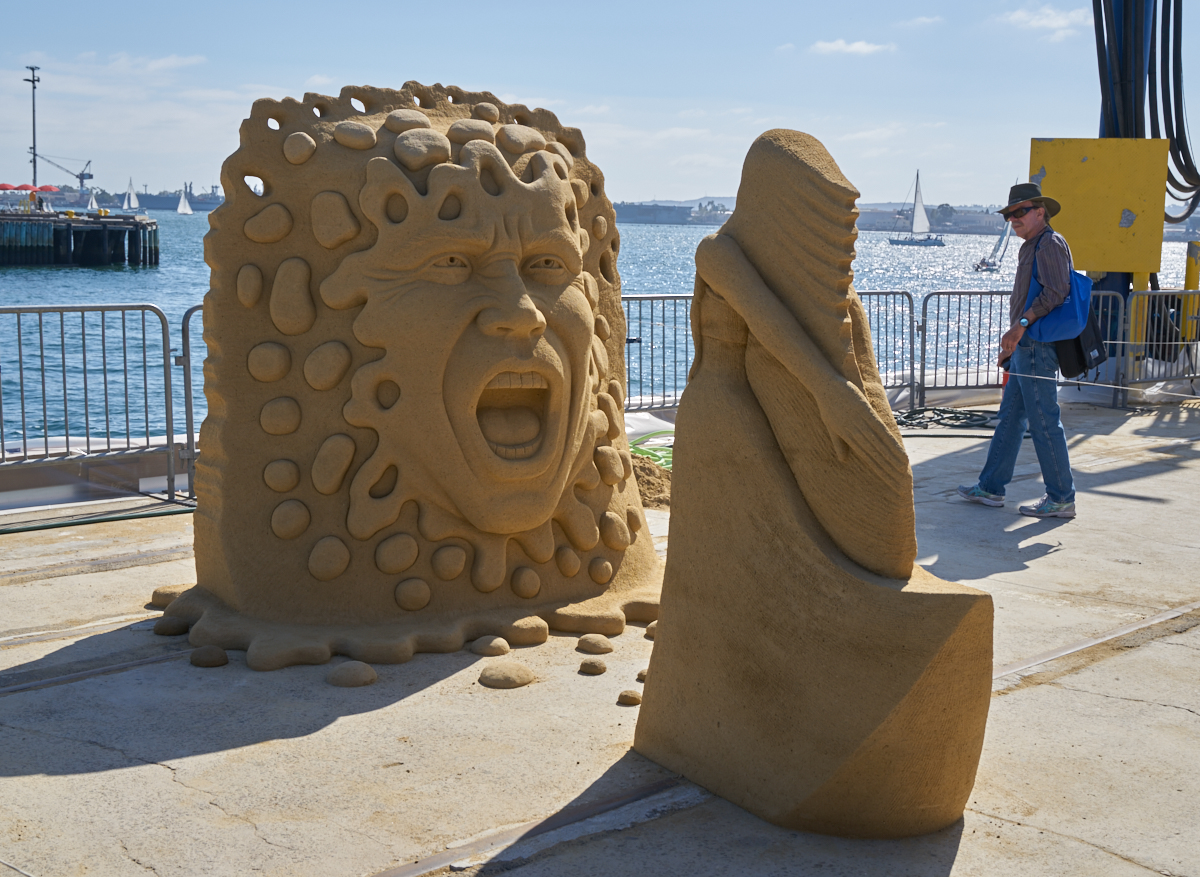 It was a super-nice Santa Ana day with temperatures in the mid-eighties, clear and no wind.  Kathleen had noticed that there was a "sand sculpting" (the current cool name for sand castles) competition at the B Street Pier.  It was Labor Day weekend so we headed downtown to check it out.