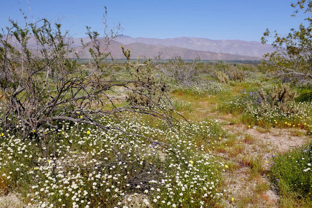 The northern ridge of the Santa Rosa Mountains is visible in the distance.  In some areas the flowers formed a dense mat of colors.