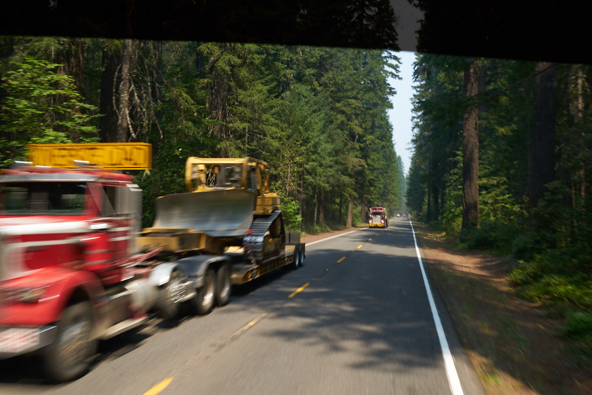 We passed tons of fire fighting equipment on the move. Above, the first truck has a 'dozer and the second one has a skidder destined for the fire lines.