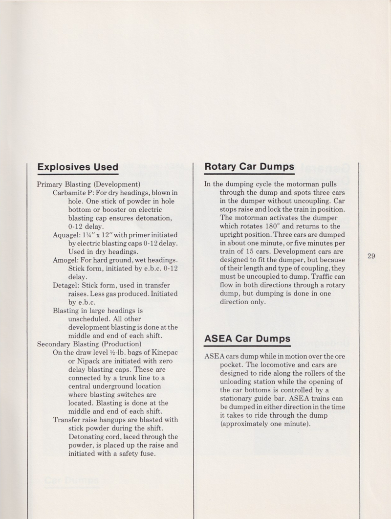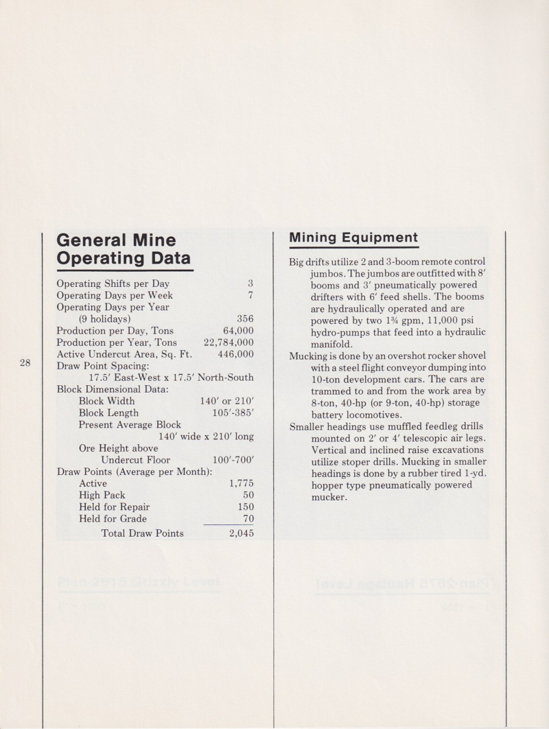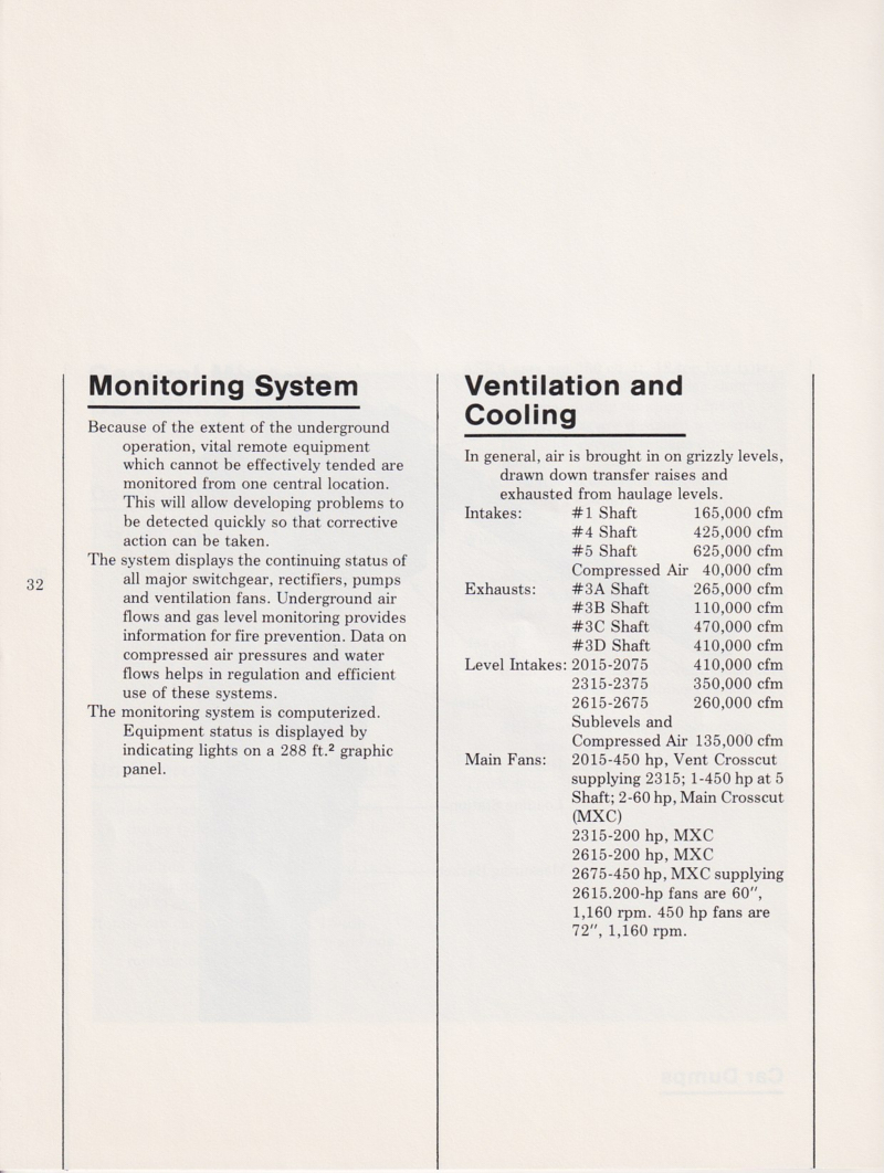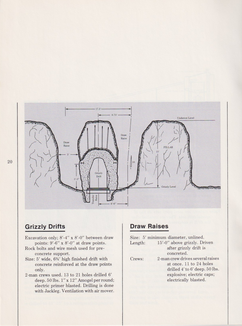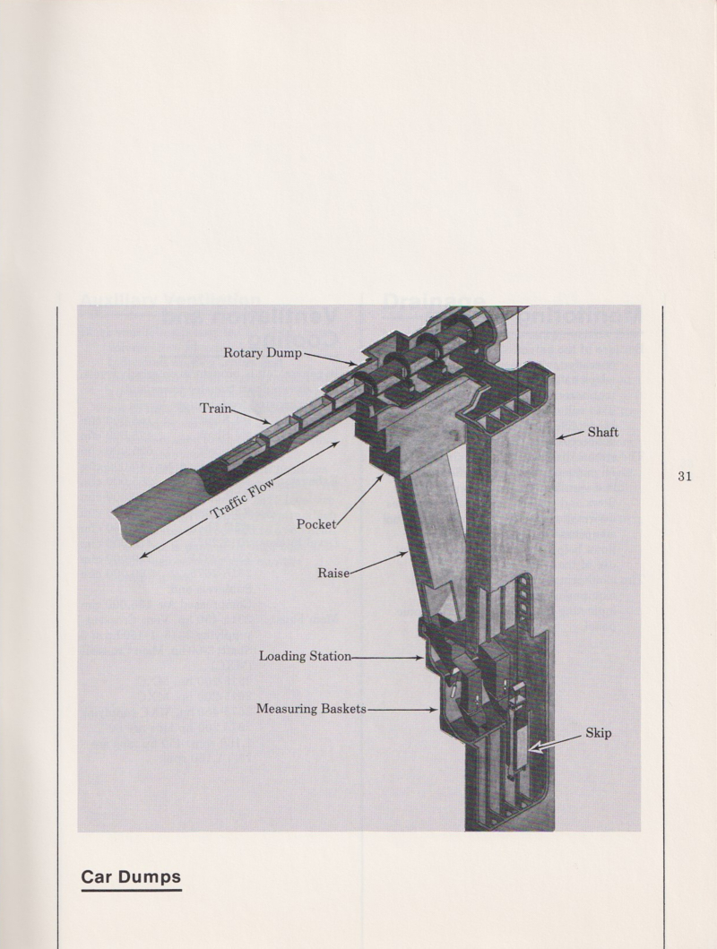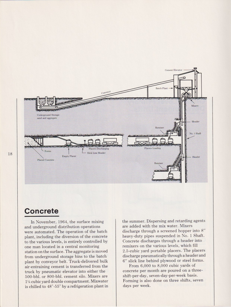 The mine had its own concrete plant for use in underground reinforcement of the tunnels.  Concrete was manufactured on the surface and then dropped down special pipe and re-mixed at the destination level of the mine.  The concrete management techniques are described below.