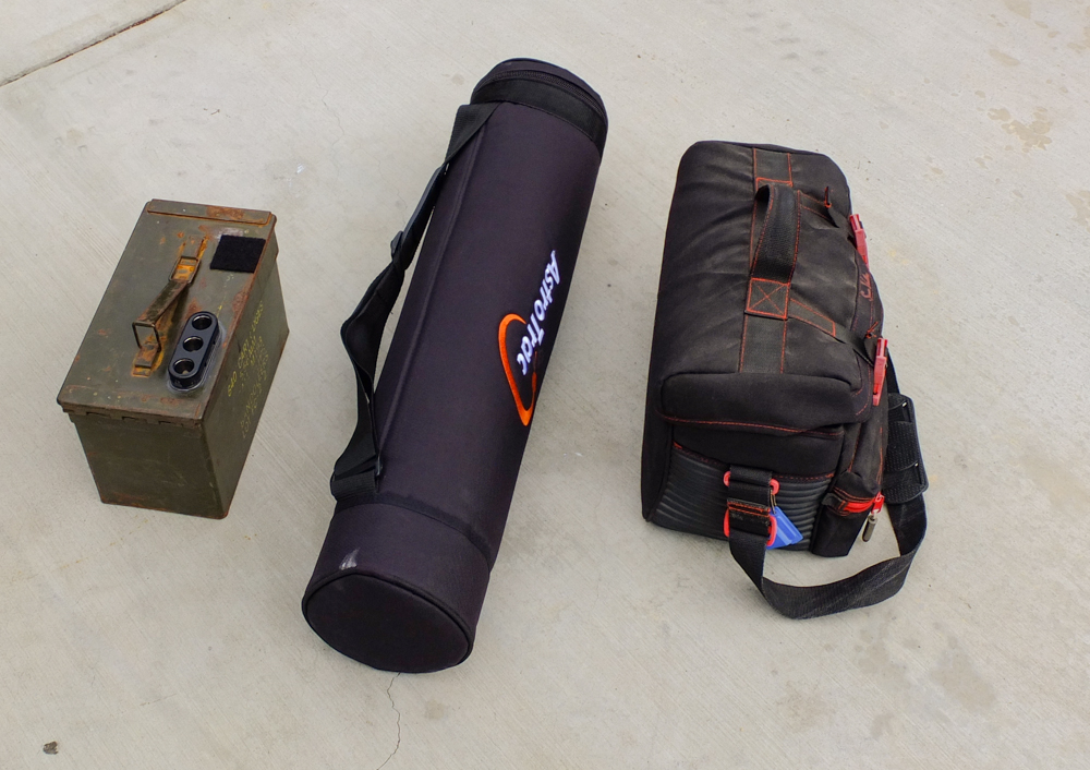The Astrotrac mount comes in a compact carrying case to provide high portability.  I had to augment the basic tube with a "battery box" and a VCR bag that contains the extras needed.  Note the 3 plugs on the top of the battery box.