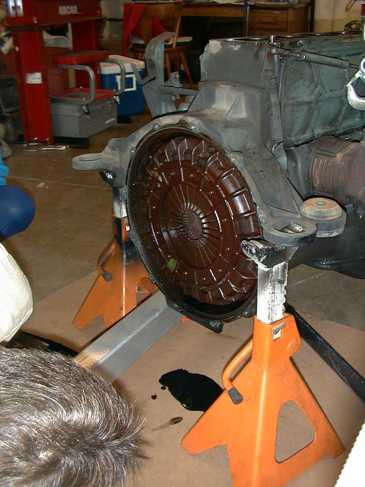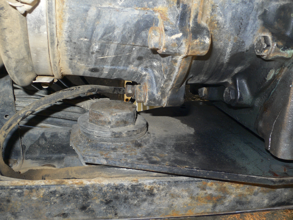 The transmission was jacked up to allow drilling into the bolt stubs to insert an easy-out screw extractor.