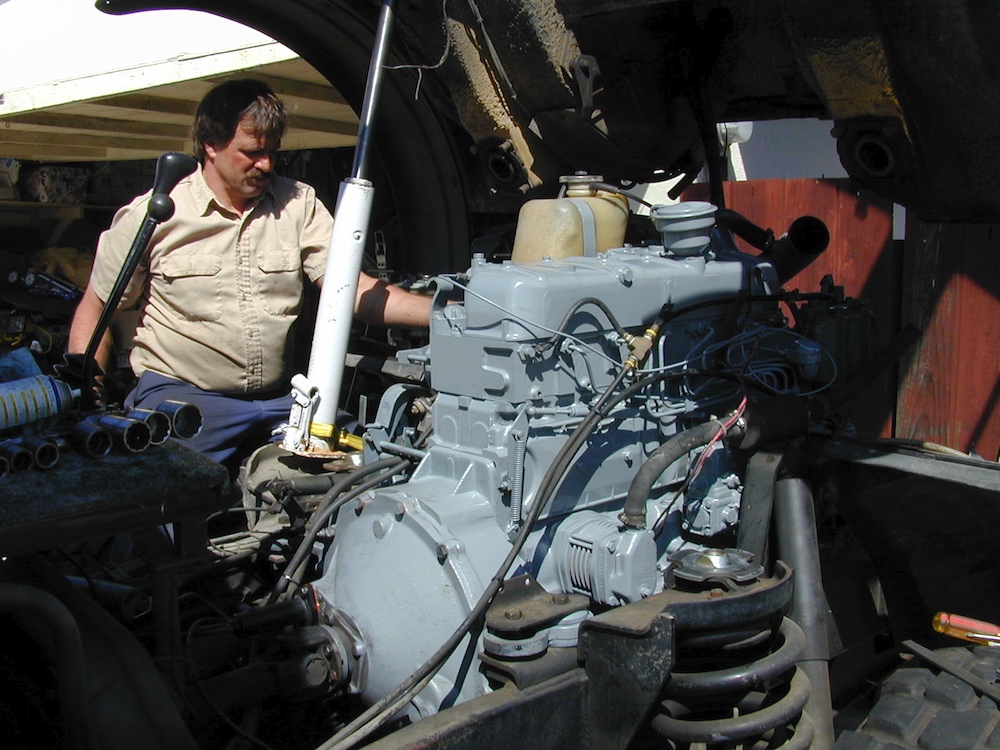 The shop manual calls for 10W engine oil in the transmission. These days, this sort of oil is easily available in Walmart at reasonable prices. The smaller cars are now using lighter viscosity oils and I have seen 0W-10W multi-viscosity oil on the shelf. The thicker the oil, the harder the tranny shifts. On mogs with the 8 speed transmission the 4-5 shift is air assisted. When you change gates from 3-4 to 5-6 you will hear a "thunk" which is the air pressure disengaging the pre-reducer gear in the transmission. The mog is a "straight 8" shift pattern, but in reality it is a 4 speed with the pre-reducer used for the lower 4 gears. The thing to note is that if you don't have air pressure, you cannot make this shift. Of course, as discussed in the Air System section of this set of pages, there are other problems to worry about if you don't have air pressure and shifting is really low on that list. When it is cold, the transmission will shift harder than when it is warm. You cannot shift the transmission fast like a car, it must be slow shifted until it warms up. Even then, it is slower than a car. The 4-5 transition is the most likely to grind when cold. You can experiment with various viscosities of oil to see what works best for you. Thicker oil works better when warm, but grinds when cold. Thinner oil does the opposite.