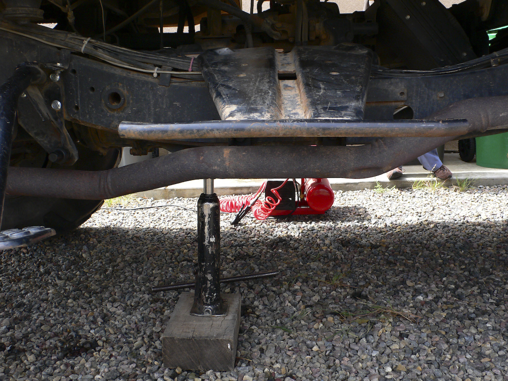 I sat there and talked to myself for what seemed like most of the afternoon and I finally came up with a possible plan. The plan was simple but unlikely to work. That said, I had no Plan B, so making a choice was easy. The plan was to use wooden blocks and one of my heavy lift hydraulic jacks to reposition the transmission into the correct location to allow selecting forward gears. Then, we would use 2 heavy duty ratchet straps to hold the transmission assembly in place. To assist in keeping it in place, we would re-install the sheared bolts to help act as pins to keep the transmission from moving around during travel. It took us several hours to get the fix in place, but we did it. I tightened those straps until they were so tight that I got "C sharp" when you plucked them!