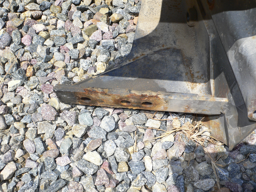 The action here is to get the bolt stubs that are broken off in the transmission case out and get them replaced with new bolts. But first, we have to remove the spare tire carrier, seen here in the center of the photo. One of the earlier owners was kind enough to weld the carrier onto the frame. Well, there was a bead where a weld WOULD have gone if he had known what the hell he was doing.