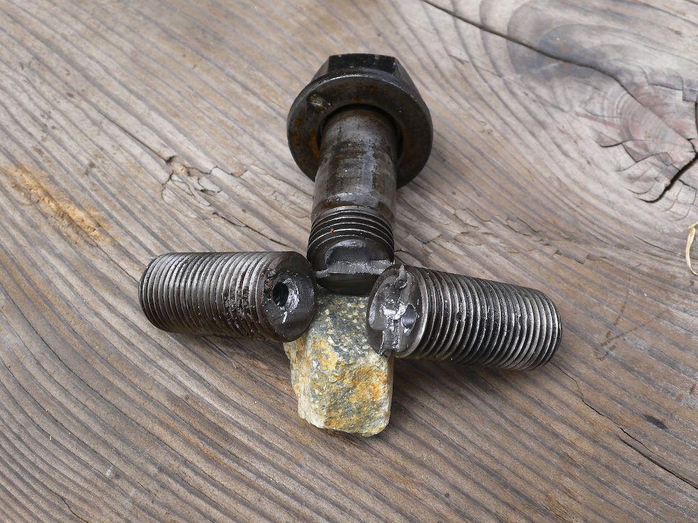 One of the bolts that came out from the bottom of the transmission mount was bent. If you look carefully, you can see the bend. These are metric 16mm 12.9 hardened bolts.