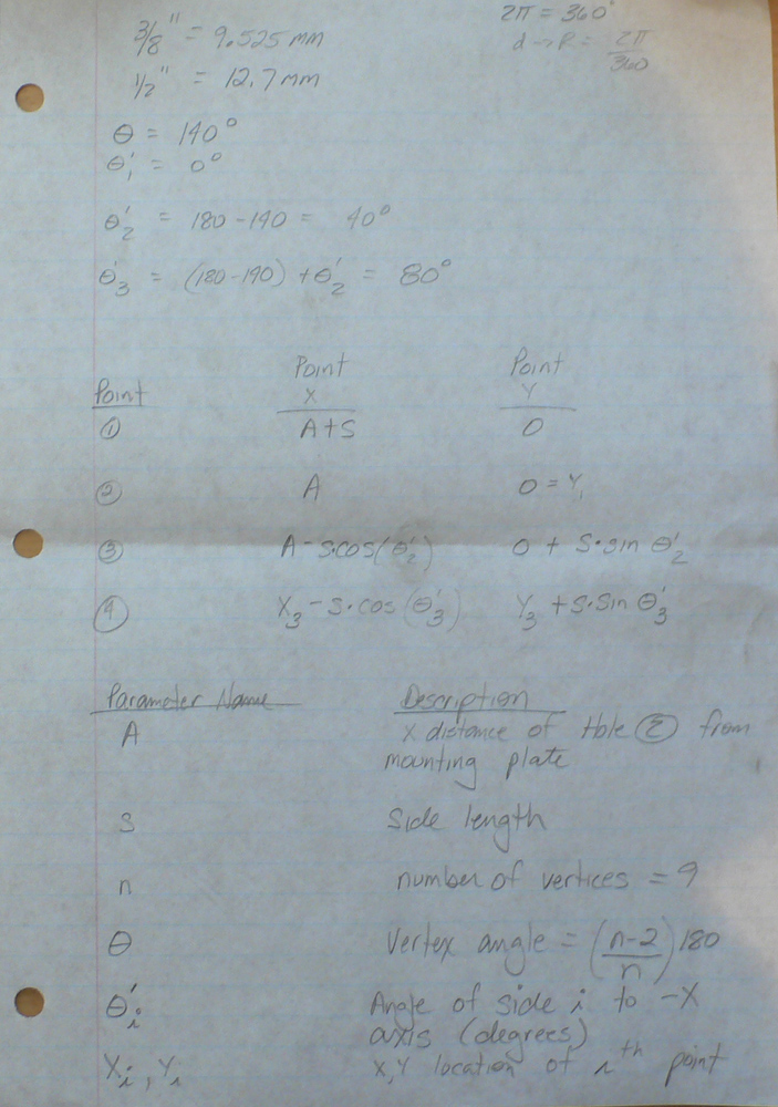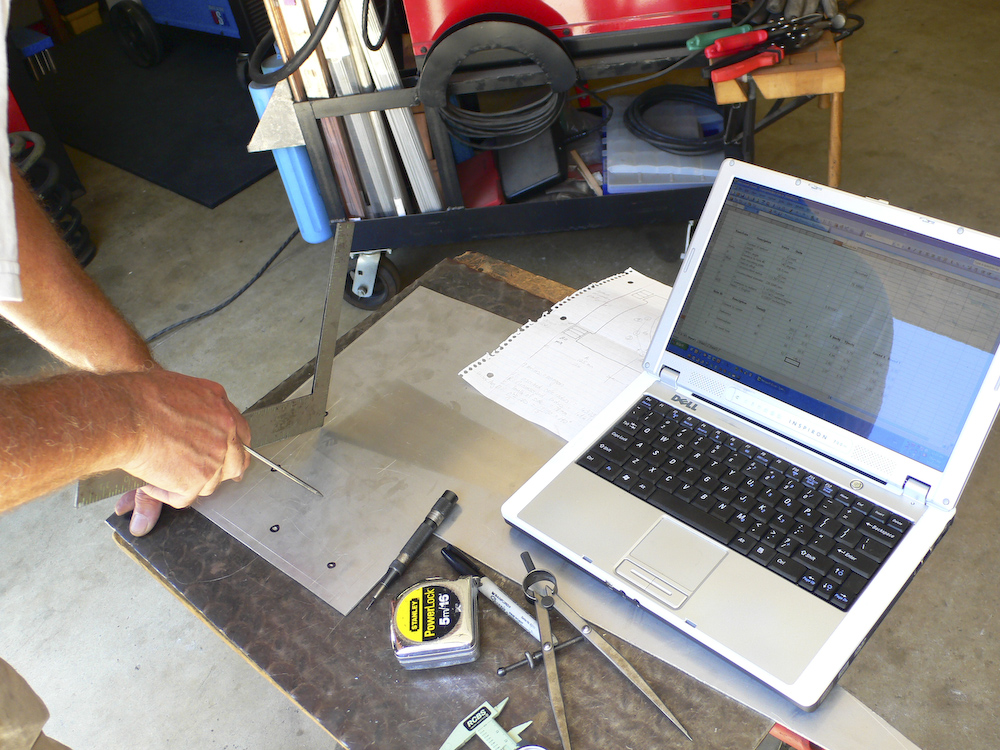 This whole thing was a good news, bad news. The good news was that the equations that determine the hole locations are easy to compute. The bad news is that the final results are critically dependent on the correct measurement of the inter-hole spacing (length of a side). Measuring accurately upside down is just plain hard. I had expected this and created a spread sheet that would allow me to enter parameters easily and then it would tell me the final locations. That was good, because our initial measurements were quite inaccurate, resulting in the need re-measure many times. The old adage: "Measure twice; cut once" was really "Measure 20 times, layout once".