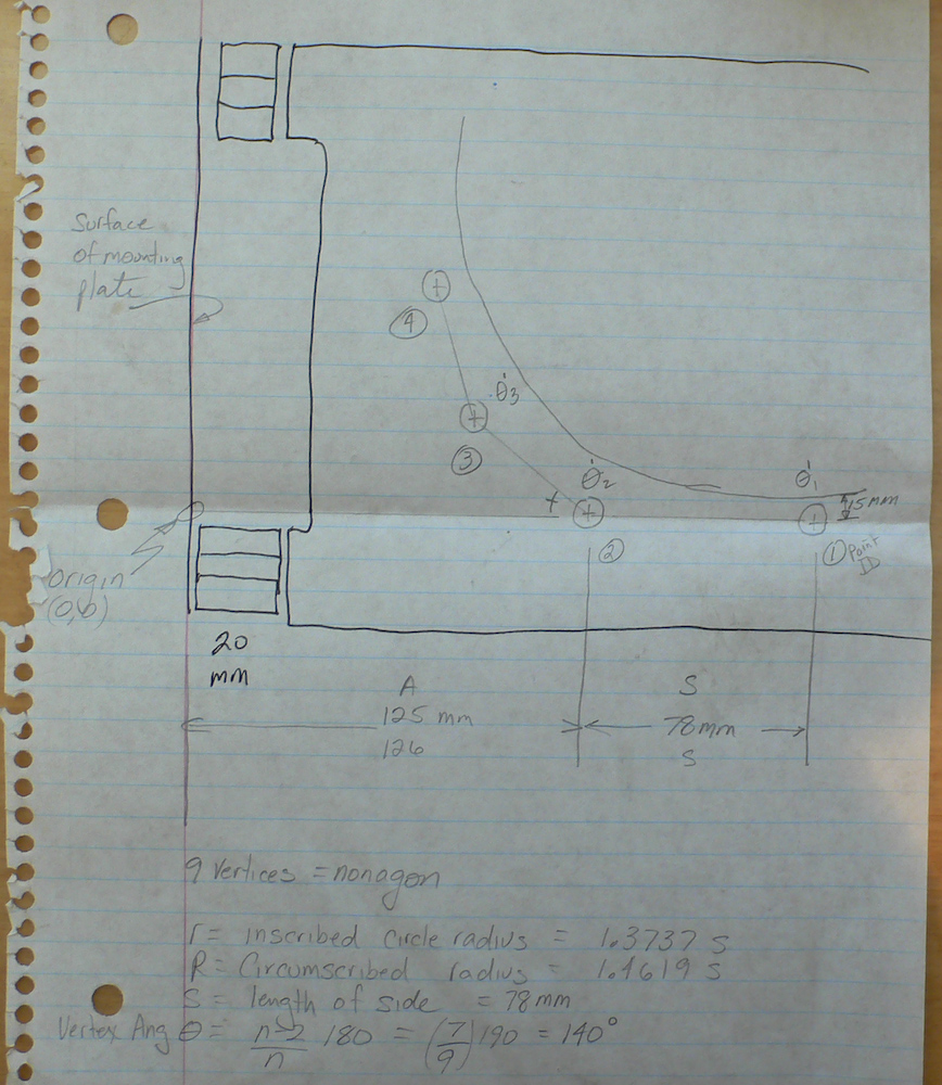 Here is a side view of the notebook page on the layout. Sadly, the case was a 9 bolt pattern which required me to exhume my CRC Math Tables to get the formula for a 9-sided regular polygon (called a nonagon). Once you assume the orientation of 2 of the holes, which in this case were horizontal, then the balance of the geometry is solely determined by the length of a side. So, making that measurement would be critical to making the bracket without having to ream and re-ream the holes. For the splint to be effective, it will have to be tight against the housing and to have all the bracket bolts tight with little or no play to accommodate the shear load due to the missing mounting bolt. Since the housing was cracked, I elected to not use the hole at all. The only real consideration was insuring that the combined strength of the 4 bolts is equal or more than the strength of the missing bolt. We were lucky that it was. Metric bolts are tagged with "classes" on the head of the bolt, in this case class 10.9. This class corresponds to the strength of the bolt. More specifically, it lists the failure strength and the point at which the bolt starts to stretch. These values are encoded in the head stamp. Class 10.9 means 100 N/mm^2 stress to failure point with a stretch point of 90% of the failure value. So, since the strength is expressed in units of force per area, if we know the area, then we can assess the overall force at the time the bolt fails. The strength of the missing 16mm bolt is PI* (16/2)^2, the old pi-R-squared formula, times the class number 12. In this case, the value is 2411 Newtons. For 4 bolts of the splint, the value is 3141 Newtons: score!