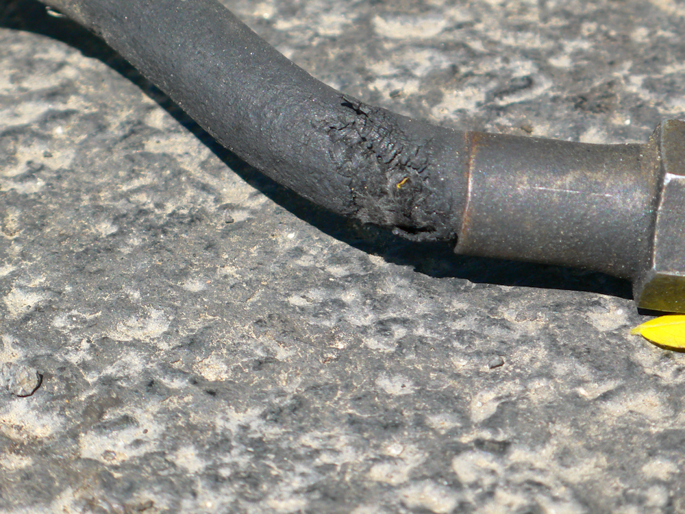 The old flex line with the ad hoc repair. What I could not see while it was installed was that the other end of the hose was violated as well.